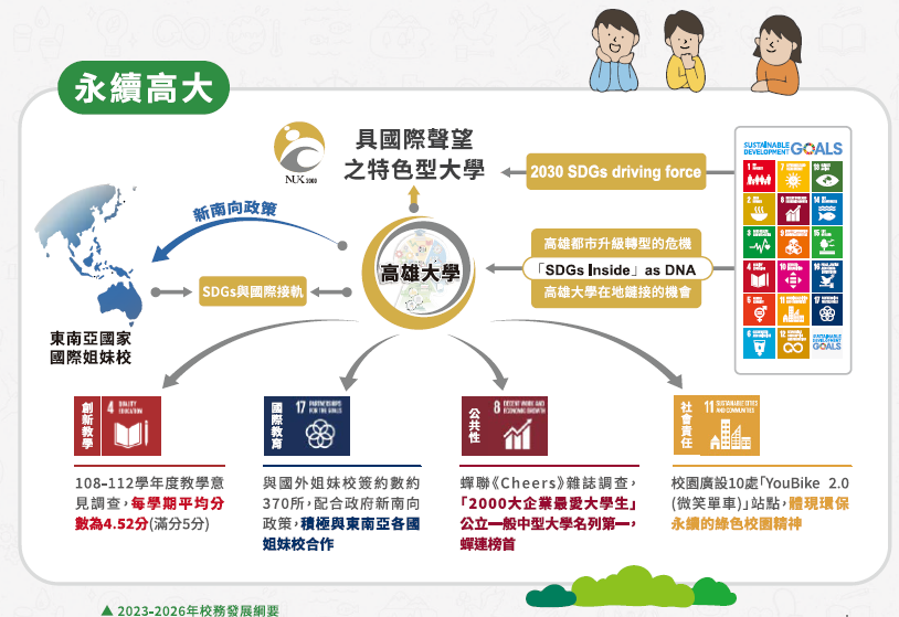 本校對內以SDGs(Sustainable Development Goals,簡稱SDGs)在地詮釋為核心驅動力,持續精進關鍵目標的實現和體制的完善,對外連結在地產官學策略聯盟與國際夥伴(東南亞大學),共同詮釋SDGs、USR與ESG 理念。我們將SDGs內化至高雄大學,配合行政院「數位國家‧創新經濟發展方案」、五加二產業創新、能源轉型及臺灣2050淨零排放策略等政策願景,培育國家發展所需之跨領域人才,藉由「SDGs-Inside」接軌國際,擬定「學用合一與跨域教學」、「特色研究與產業鏈結」、「永續大學與素養深化」及「社會責任、國際化與在地鏈結」等四大校務發展目標,致力於達到「結合教學研究與產業發展,重視人文素養與科技創新,培育精英人才之特色優質大學」之學校定位。