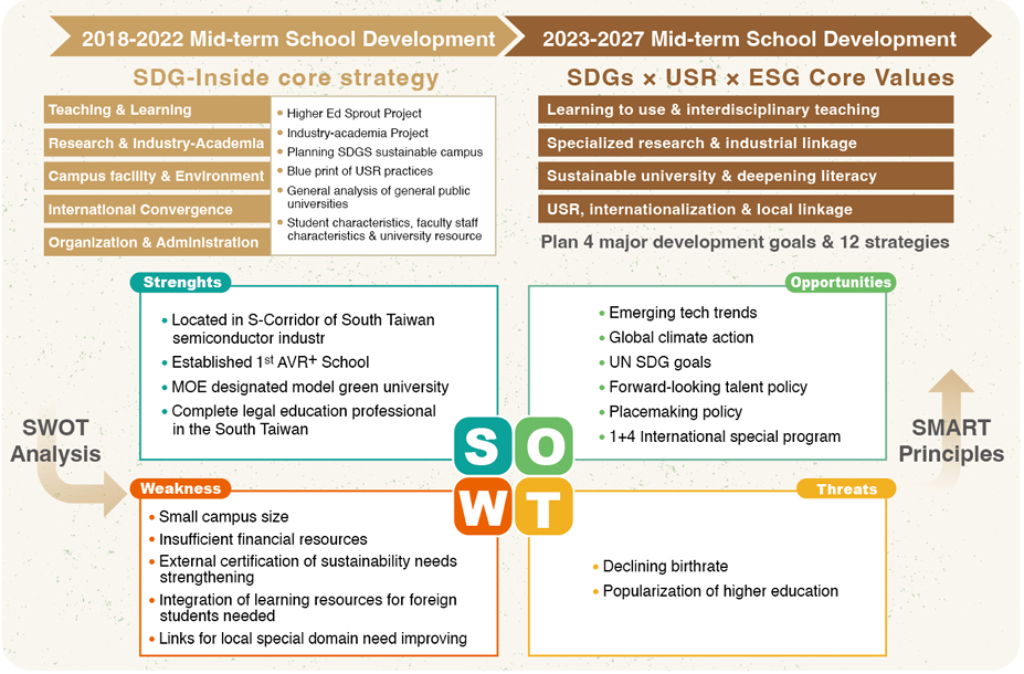 Taking SDGs-Inside as the core trend, the University comprehensively considers the changes in the current socio-economic environment, and based on the effectiveness of the implementation of related programs, such as the Ministry of Education's Higher Education Sprout Project, the Industry-University Cooperation Program, the SDGs Sustainable Campus Planning, and the University's Social Responsibility Practice Blueprint, analyzes the overall development potential of the University, and formulates specific and feasible action plans.