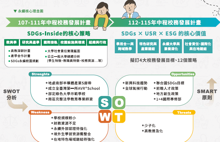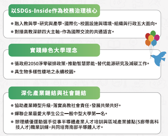 - 鼓勵師長發揮專長、跨域合作對接上努力,結合社會企業與高大締盟,合作推動淨零轉型等「SDGs + ESG具體行動方案」,發揮產學合作最大效益,跨域推廣校內外SDGs素養。