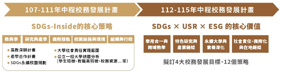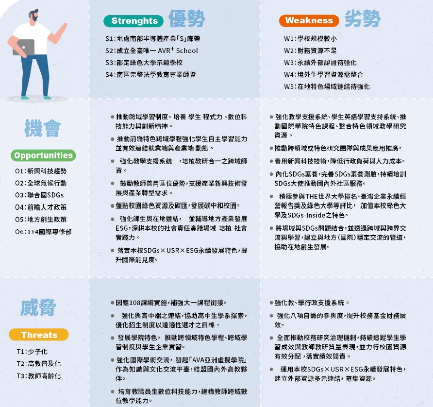 面對前述SWOT分析結果,在過去本校在執行2015至2017年教學卓越計畫成果,即擬定2018至2022年校務發展重點,從(一)教學創新彈性化;(二)產學在地深根化;(三)國際合作SDGs鏈結化;(四)「SDGs-Inside」特色加值化等方向持續精進,提出五大校務發展策略目標、評估指標及行動方案;而2023-2026年除延續前期「SDGs-Inside」核心理念,強調建立外部資源的多元連結,更透過SWOT分析學校發展潛力,擬定四大發展目標、12個策略與行動方案。