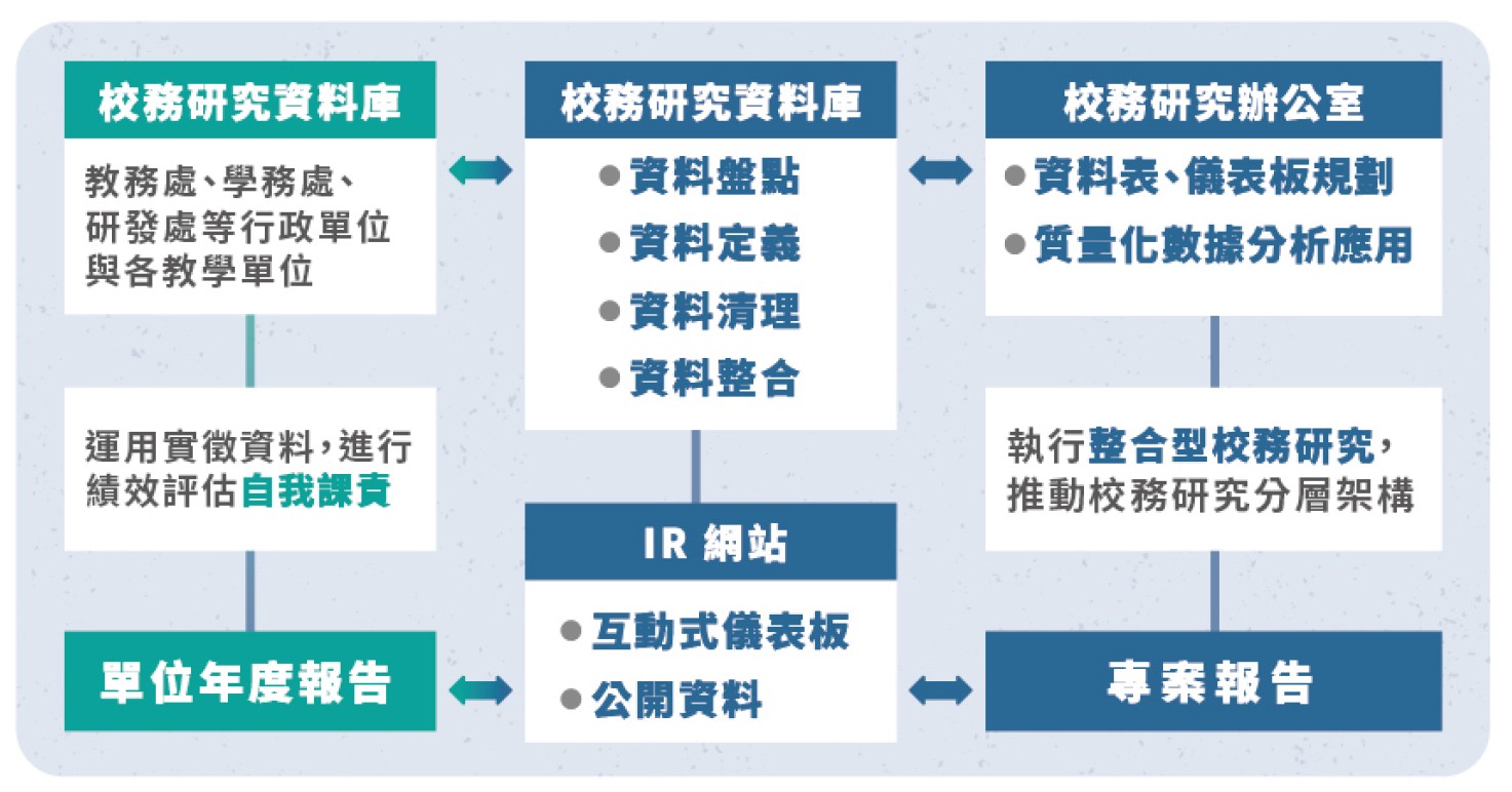 現行校務研究機制區分為Top-down與Bottom-up兩類,以推動校務分層治理架構,達到兼具決策高度與執行力並重之目標。前者為校務研究辦公室統籌規劃及執行之整合型專案研究,後者為校內行政單位與教學單位提出之議題合作。此外,為增進校務決策觀點之多元化,訂有教師議題合作執行規劃草案,透過教師議題合作案之徵件與審核,提升校務研究決策品質。相關分析報告與數據統計報表依資料機密性,適度收錄於年度問責報告,並發布於本校校務研究資訊公開平臺,提供利害關係人查閱。