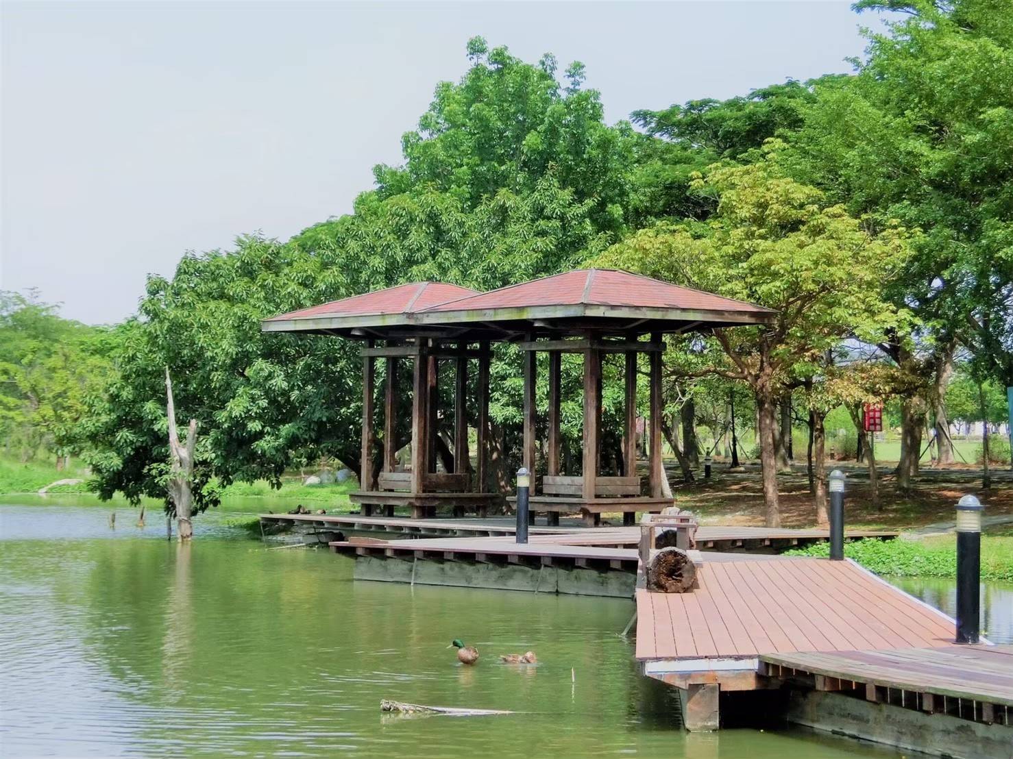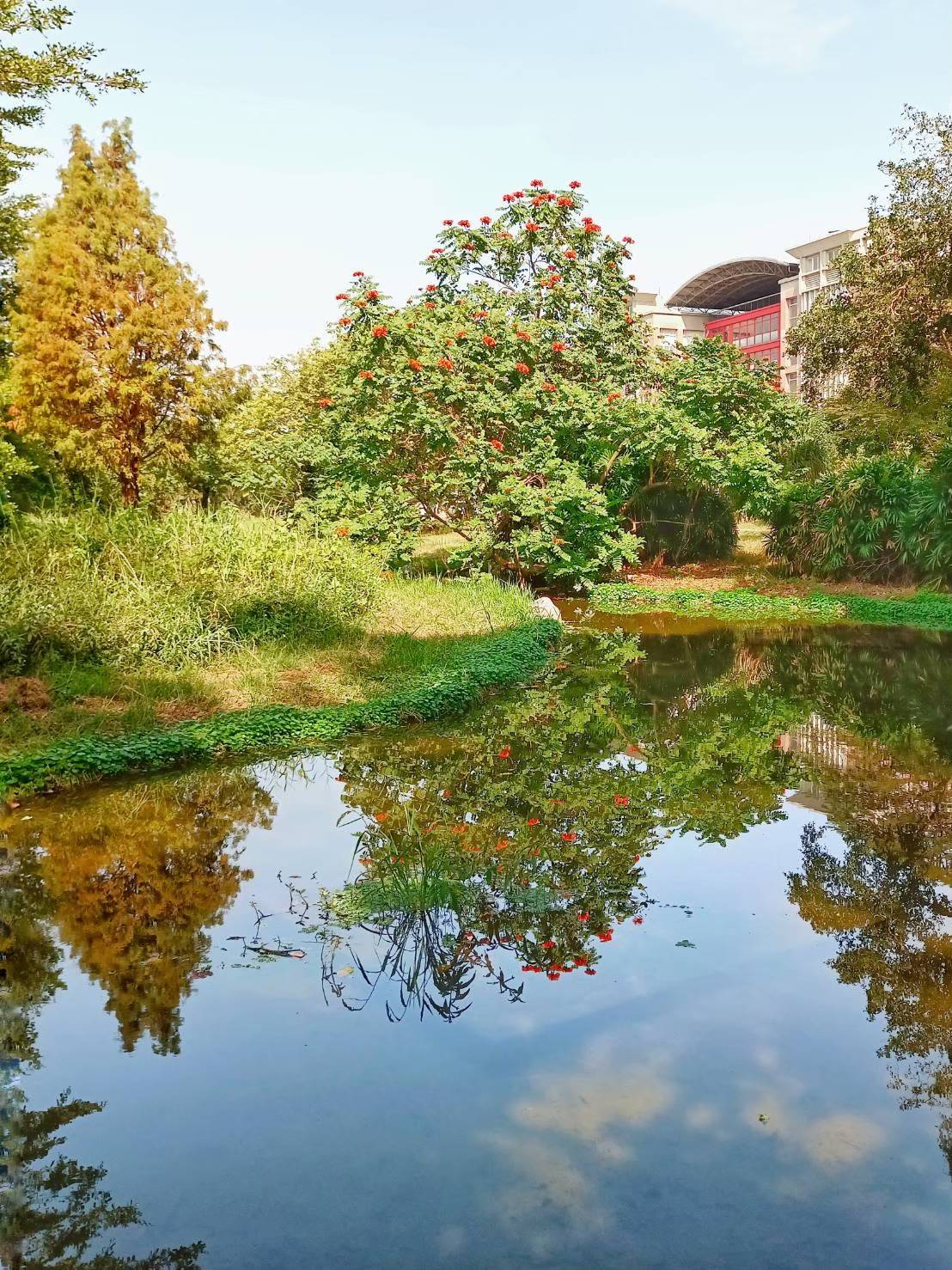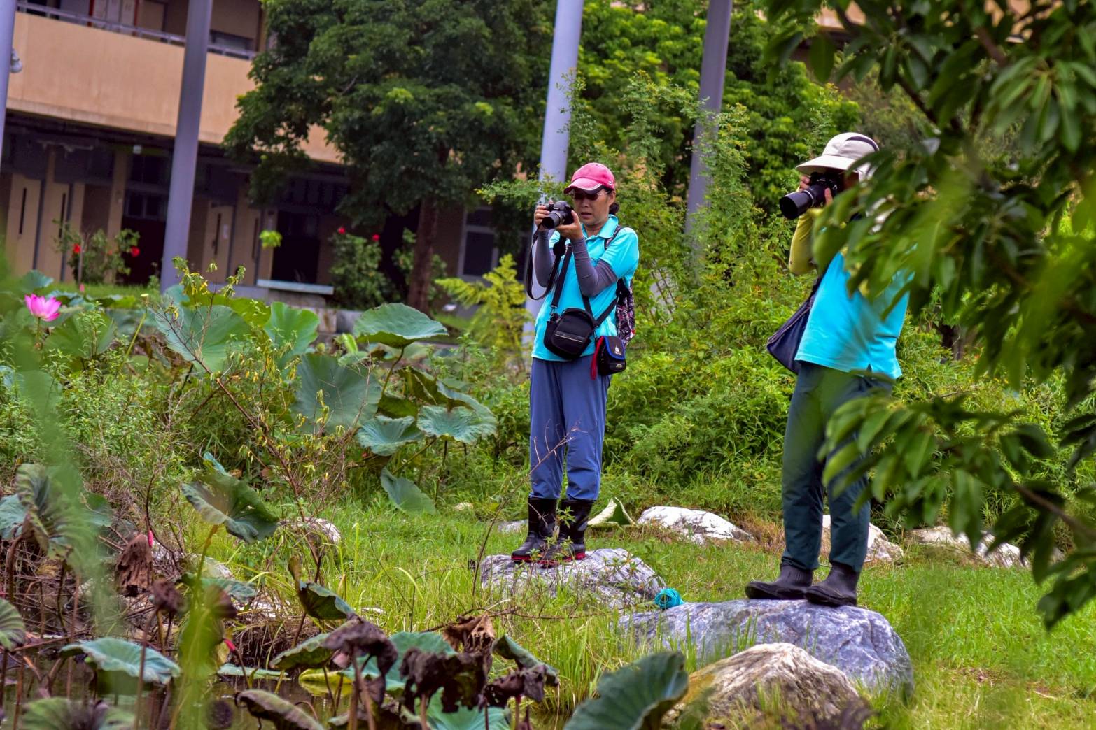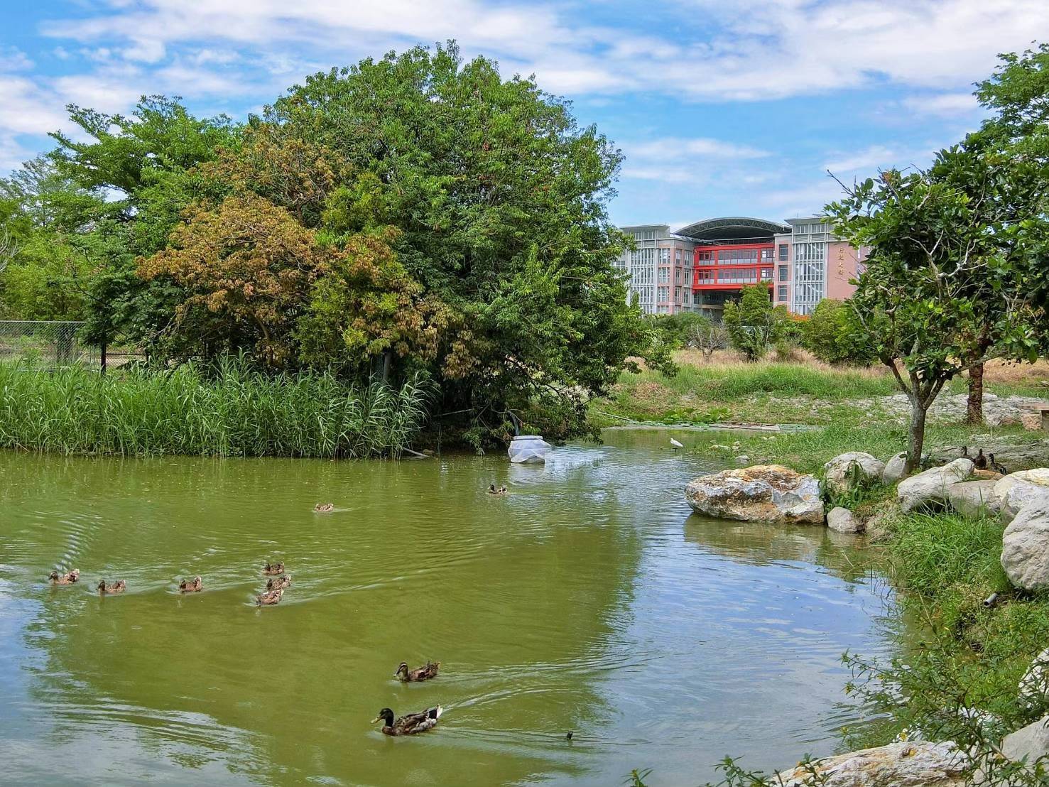 2002年完工的生態湖與河道,不僅僅是學校內的一處水域景觀,而是真實負載都市環境中的綠地休閒功能與生態系統復育任務的區域。與緊鄰的亞熱帶闊葉密林,已共同組成生態復育的核心區,湖中常可見紅冠水雞攜家帶眷悠游水面,也常見翠鳥停棲在木棧道上伺機覓食,黃小鷺、栗小鷺、夜鷺偶爾也會現蹤跡,至於2009年放養的幾隻綠頭鴨,則是湖面水芙蓉的最佳清潔工,湖面上的生態漸趨豐富平衡,湖面下的生態,面對民眾放養及過度餵養,造成魚類魚種與數量失衡的問題,則是學校進一步需要面對的挑戰!